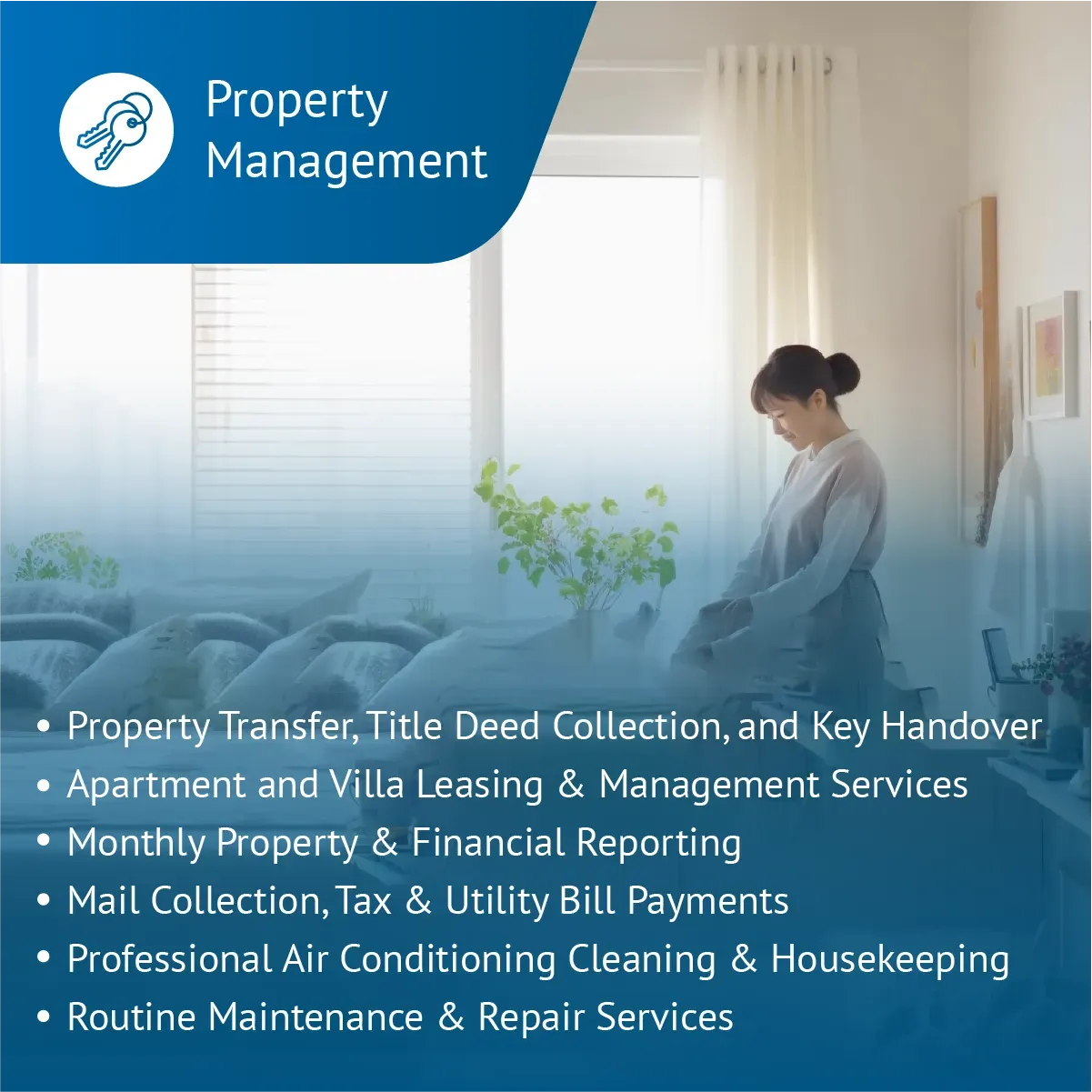 Founded in 2015, utilizes advanced real estate technology to maintain the quality of your assets. We provide comprehensive, 360-degree property management and after-sales services without barriers, delays, or distance limitations. With us, you’ll enjoy exclusive, concierge-level care and VIP treatment.